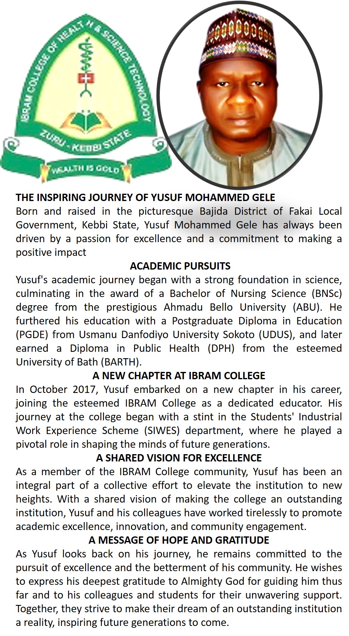 IBRAHAM College of health, Science and technology is a private-tertiary Instruction with the aim of training paramedics. The college was established in 2016 and it is a residential, non-residential and co-educational to provide health expertise with the objective of providing training and capacity building meaning to uplift the primary, secondary and tertiary health care delivery, especially in the northwest zone and Nigeria as a whole.